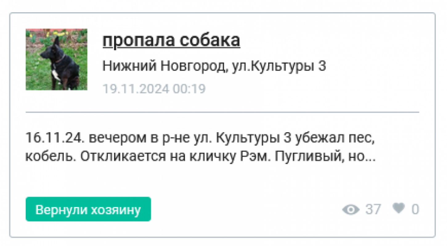 16.11.24. вечером в р-не ул. Культуры 3 убежал пес, кобель. Откликается на кличку Рэм. Пугливый, но безобидный. Если кто то видел, просьба сообщить. Нашедшим вознаграждение 10тыс